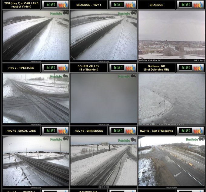 | Webcams through SW MB showing snow morning of May 9, via robsobs |